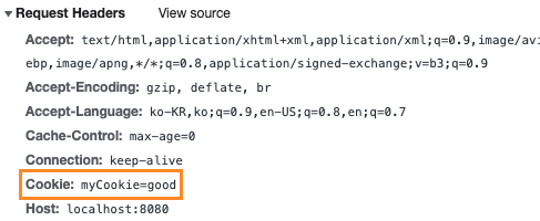 Cookie가 설정된것을 알수 있다. 우리가 지정한 myCookie가 설정되어있다.