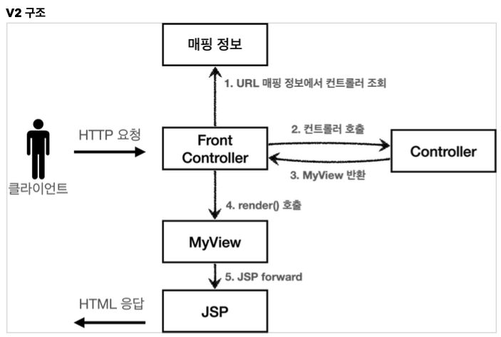 기존에는 controller에서 JSP로 바로 forward 했지만, 이번에는 Controller는 MyView를 반환하고 이를 Front Controller가 render()를 호출하여 JSP를 호출하도록 만들었다. 코드로 살펴보자.