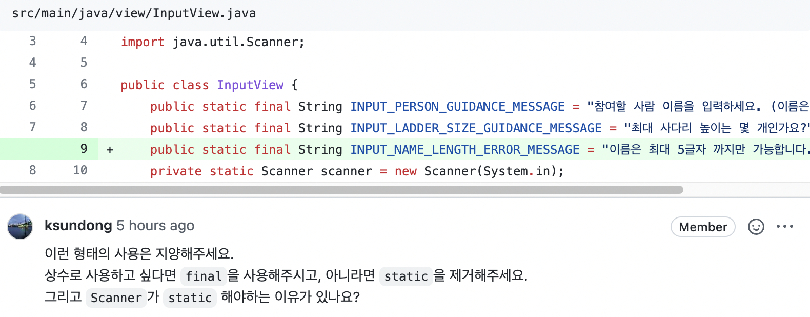 일단 여기서 static을 사용한 이유는 InputView 자체가 static 메서드만을 포함하고 있기 때문이다.