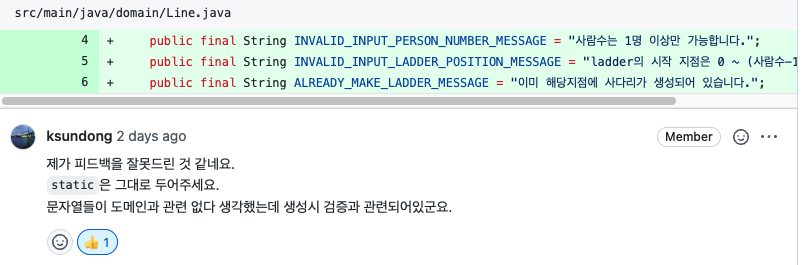 내가 static을 사용한 이유는, class level에서 생성해 두면 각 객체마다 String 인스턴스를 가지고 있을 필요가 없어지기 때문이라 생각했다.