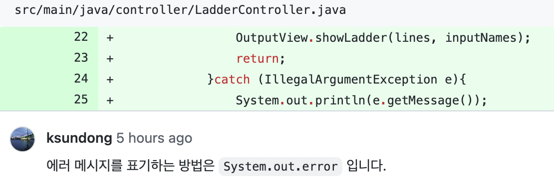 에러 출력을 println으로 하고 있었다. 다음과 같이 추천해주신 내용으로 변경하였다.