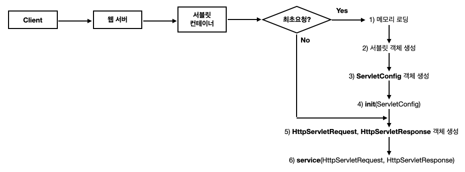 서블릿 컨테이너는 요청받은 서블릿이 최초의 요청이라면 해당 1) 서블릿을 메모리에 로딩하고 2) 객체를 생성 합니다.
