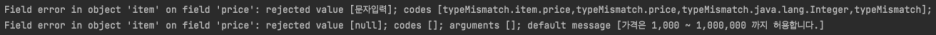 예를들어 가격부분에 범위를 넘어서는 가격을 추가했다고 해보자. 그렇다면 다음과 같은 FieldError가 추가될 것이다.