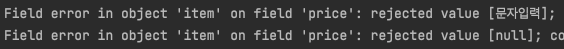 1) Field error가 'item'이라는 객체에서 발생했다고 나온다. price에는 [문자입력] 이라는 잘못 입력된 값 이 저장되어있다.