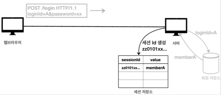 1) 세션 생성 : sessionId생성, 세션 저장소에 sessionId와 값을 저장, response에 쿠키를 생성하여 클라이언트에게 전달.