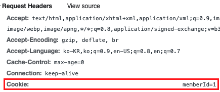 또한 서버에 요청시 다음과 같이 request에 Cookie가 설정되어 서버로 전달된다.
