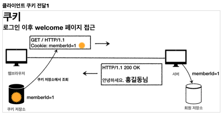그러면 브라우저는 앞으로 서버로 요청을 보낼때 마다 이전에 받은 쿠키를 지속해서 서버로 보내준다.