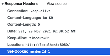 브라우저에서는 서버에서의 response header를 열어보면 Cookie가 담겨있음을 확인할 수 있다.