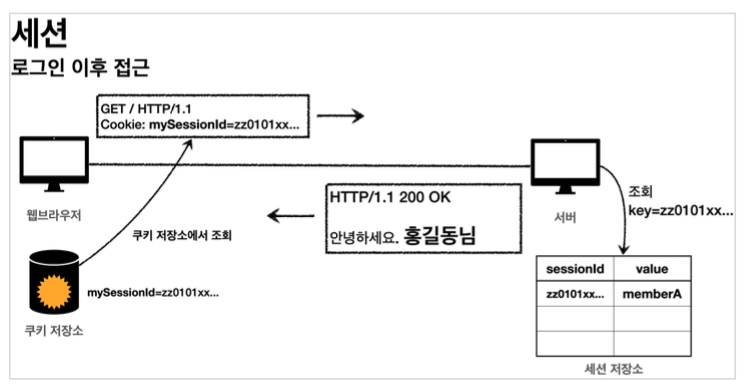 2) 세션 조회 : 클라이언트가 요청한 sessionId 쿠키의 값으로 세션 저장소에서 보관하고 있던 값을 찾아온다.