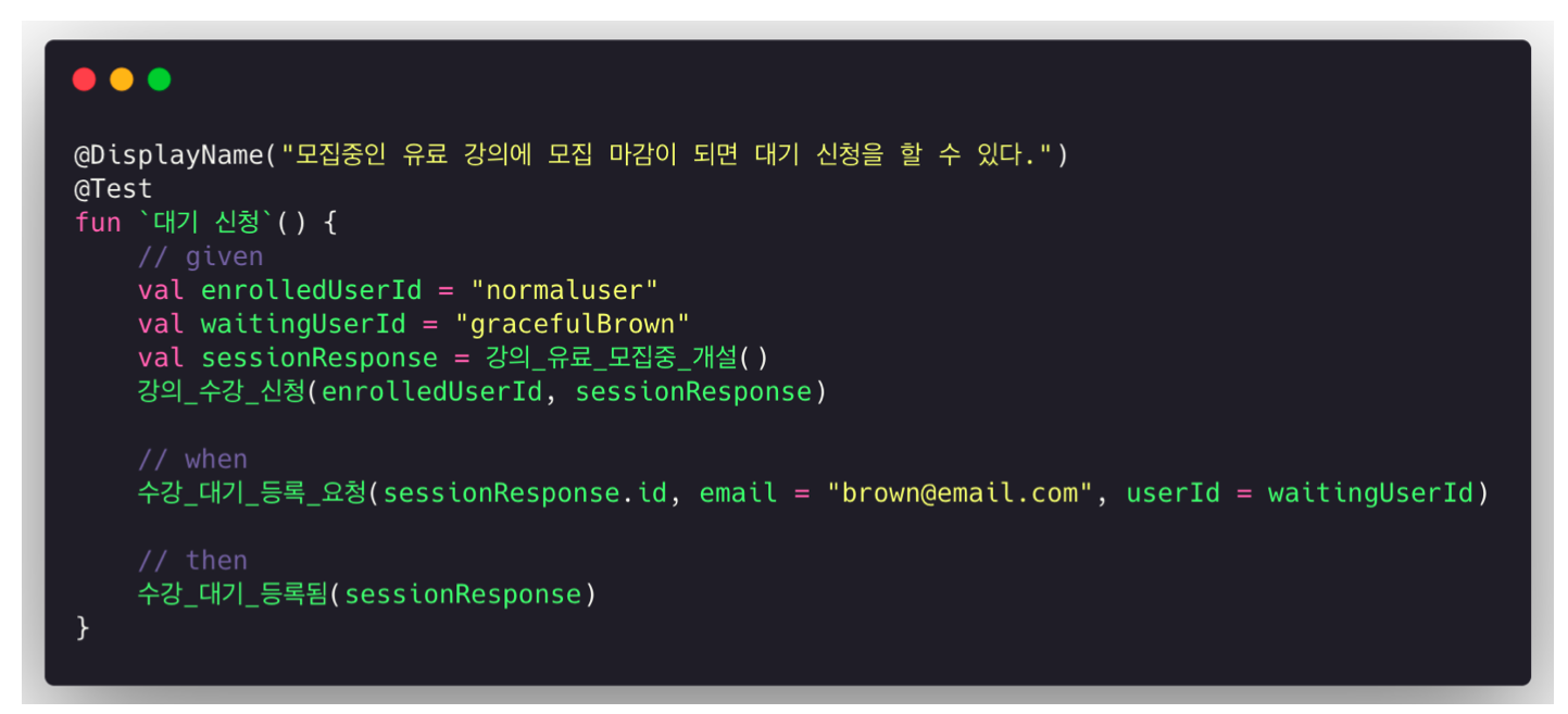 - 인수 조건을 표현하는 시나리오 기반 표현 방식 사용(ex. Given/When/Then)