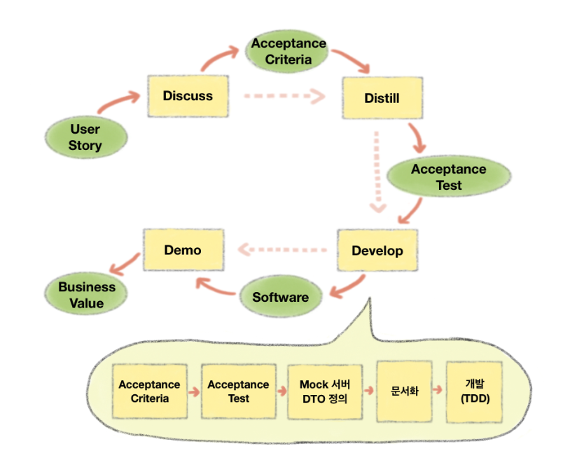 개발을 하기전 인수 테스트 먼저 작성하여 전체적인 가이드 라인을 잡는다. 이후 그 인수 테스트를 충족시키기 위해 개발을 해 나간다.