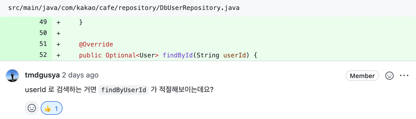 하지만 변경사항이 생기면서 userId(String)를 통해 찾아오도록 변경했는데, 파라미터를 변경하면서 메서드의 이름을 바꿀 생각을 하지 못했다.
