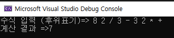 cout << "수식 입력 (후위표기)=> ";