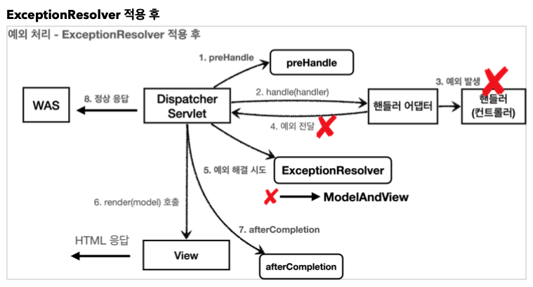 ExceptionResolver 를 활용하면 예외가 발생했을 때 이런 복잡한 과정 없이 여기에서 문제를 깔끔하게 해결할 수 있다.