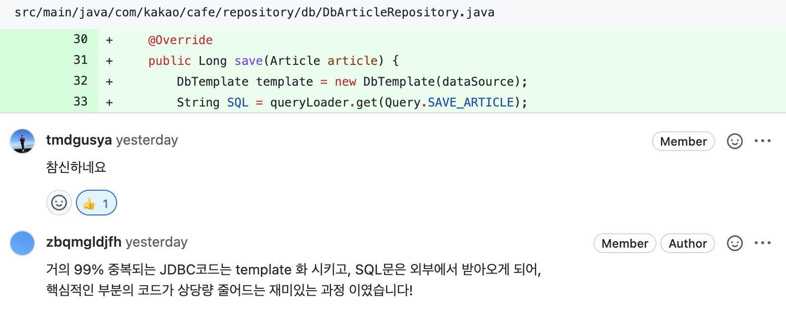 안녕하세요! Shine 입니다! 우선 리뷰를 해주시는 리뷰어 님께 감사의 인사를 전합니다! 기능 구현 DbTemplate(JdbcTemplate 구현해보기) 우선 이번 과제는 지난번 Roach가 반영해주신 namedParameter를 적용하