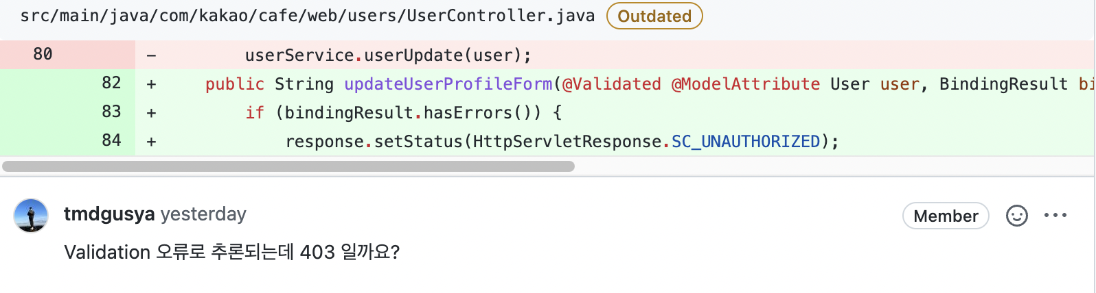 이때 해당 메서드가 사용자 폼에 접근하는 부분이라 403 에러를 보여주게 했었다.
