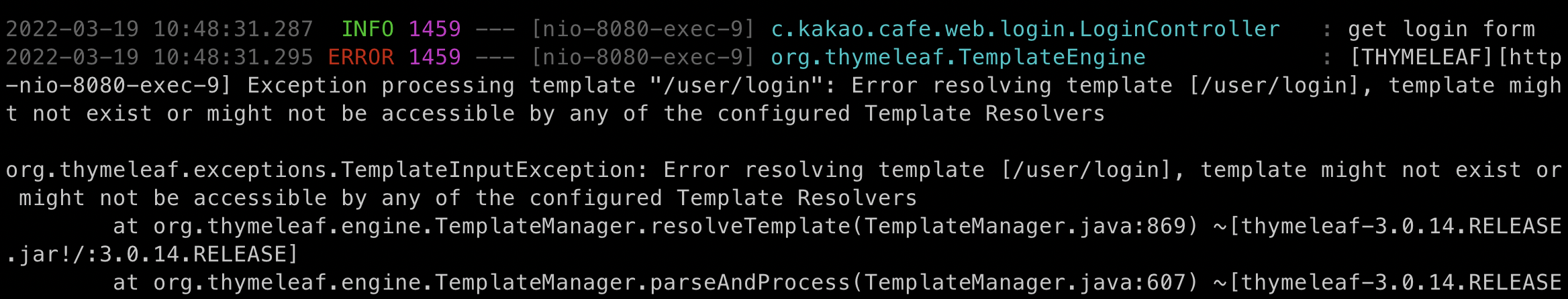 ERROR 로그를 읽어보면 template 인 "/user/login" 이라는 템플릿을 인식하지 못하여, 없는 파일이거나, 접근할 수 없다는 에러를 보여주고 있다.