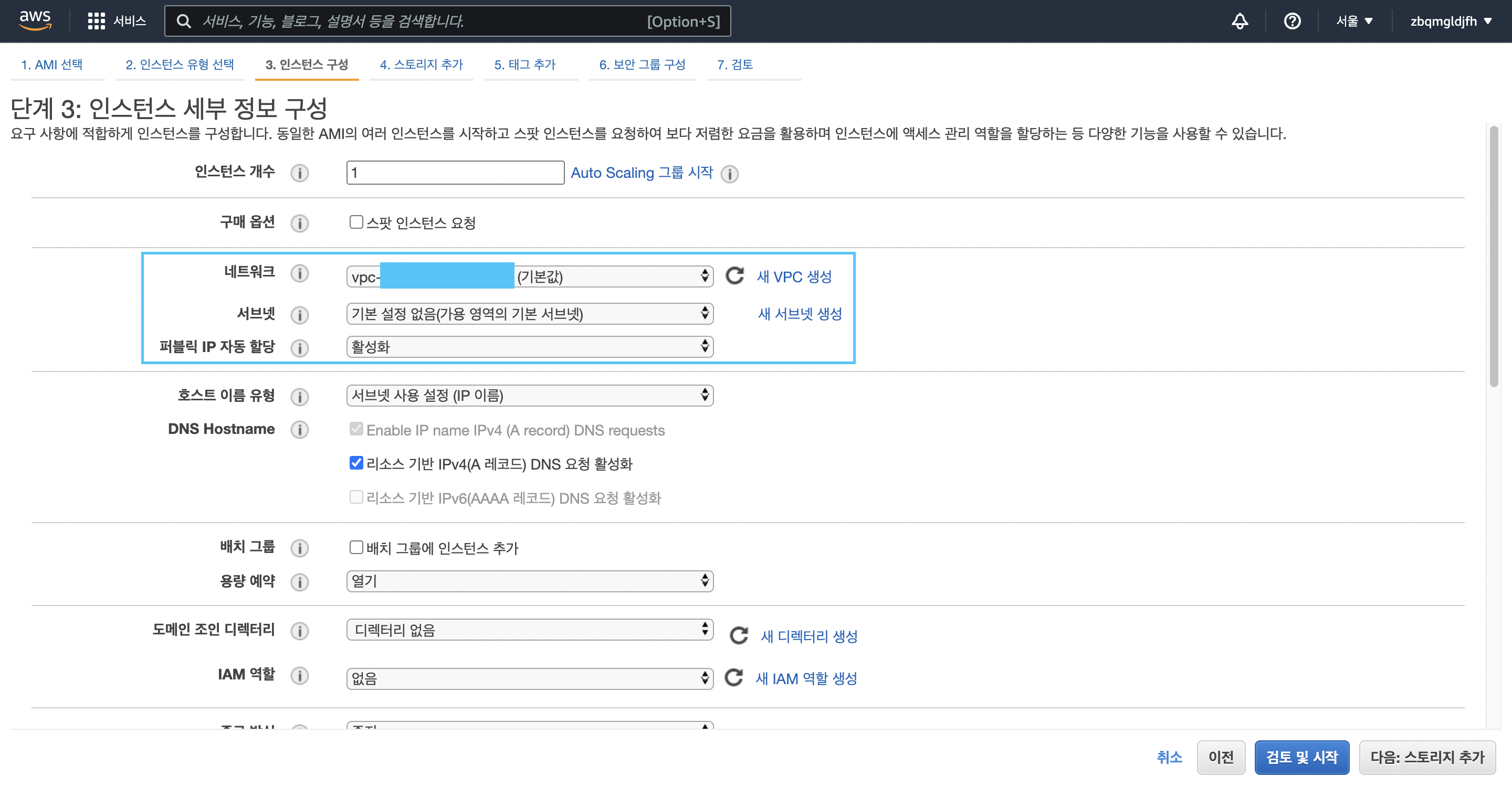 네트워크로 미리 생성한 VPC 혹은 새롭개 VPC를 생성하여 선택해 준다.