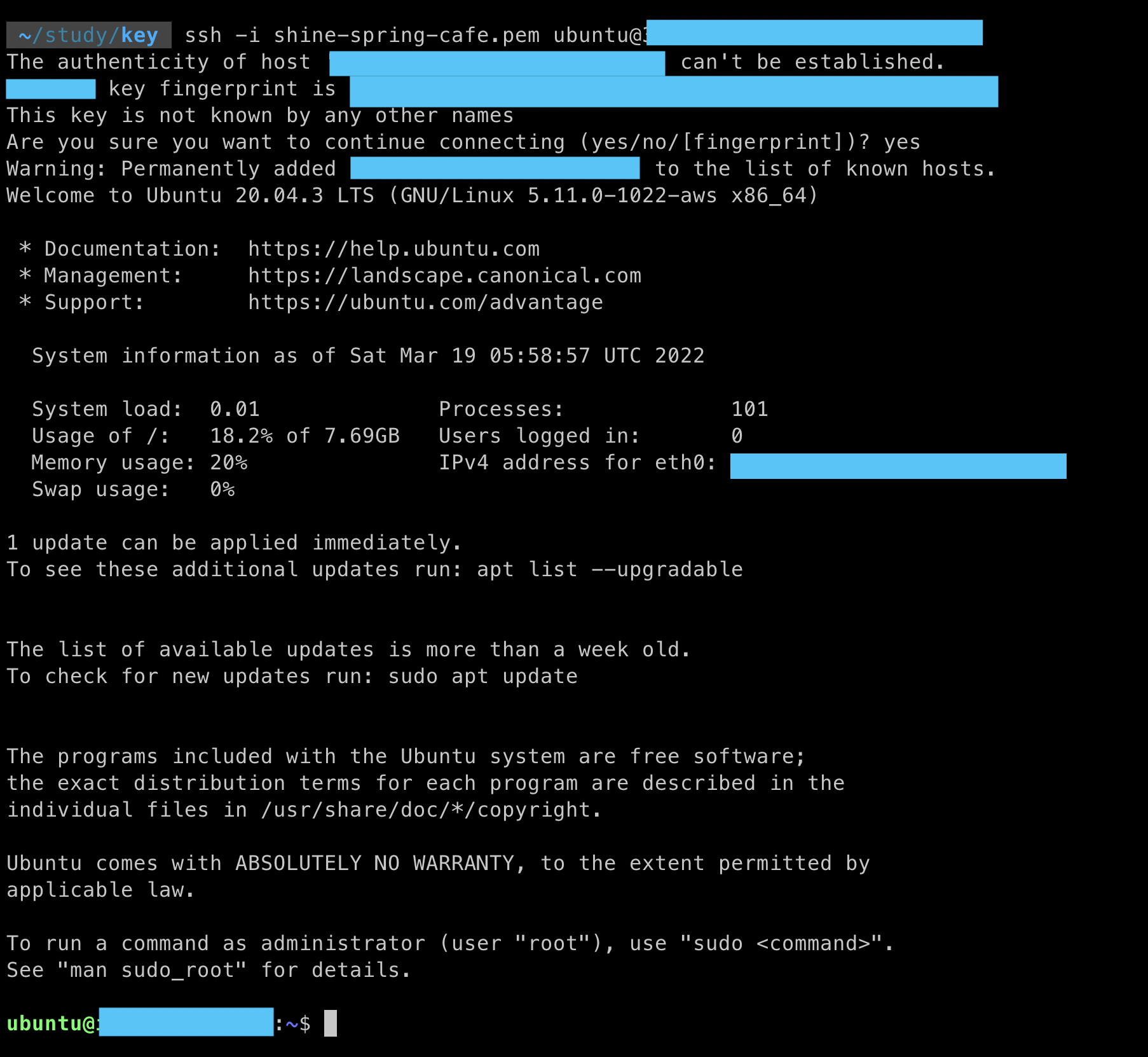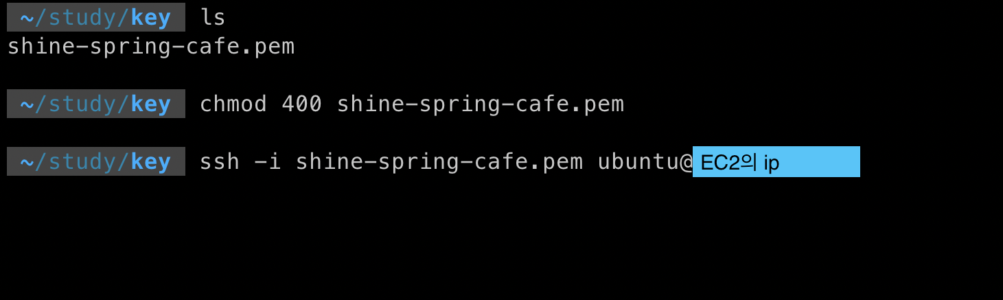 마지막 명령이 접속인데, ssh -i (키 파일) (원격서버이름)@(서버의ip) 를 입력하면 접속할 수 있다.