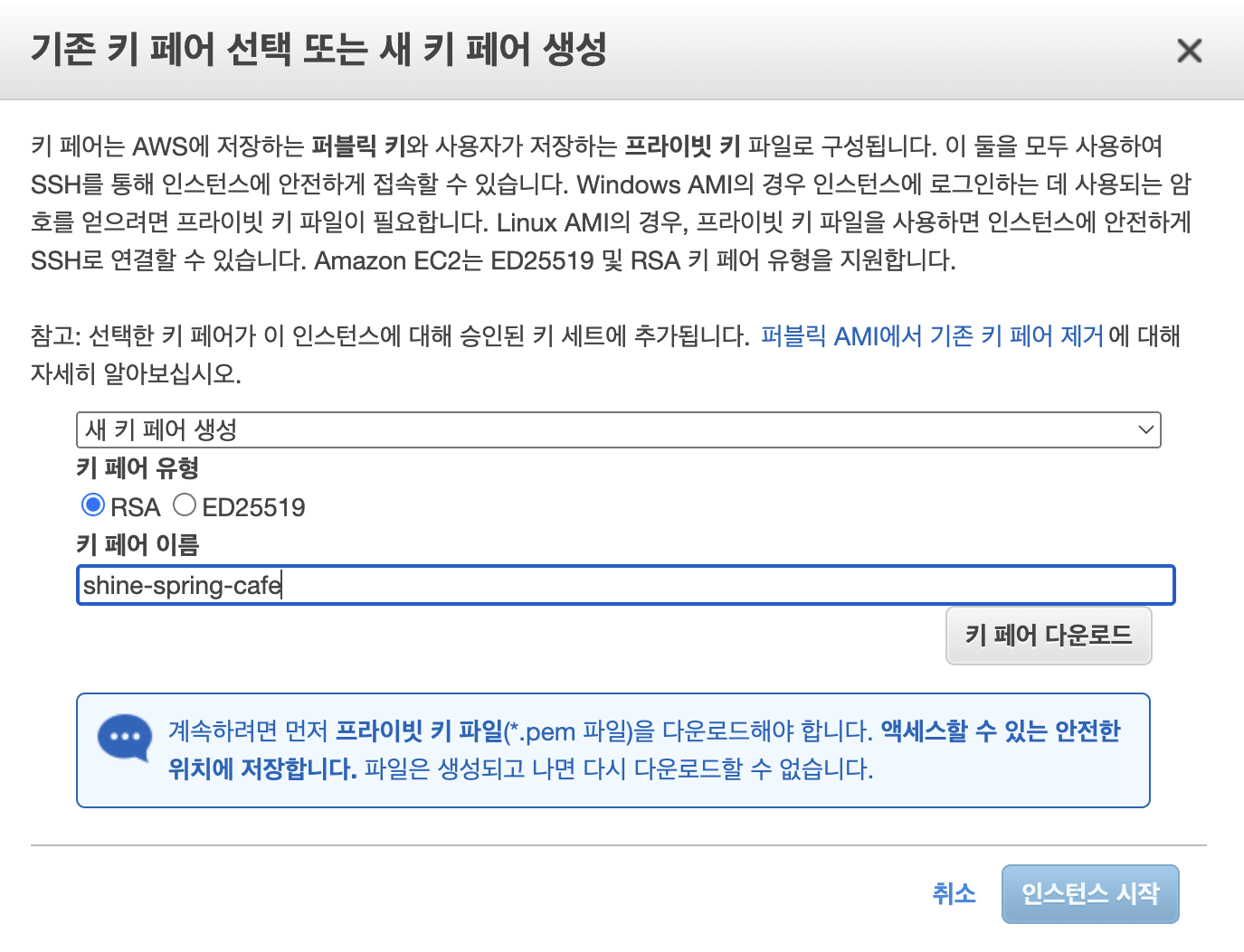 아마 처음 생성한다면 "새 키 페어 생성" 을 클릭한 후, 키 페어 이름을 설정한 후, 키 페어 다운을 누르면 된다!!