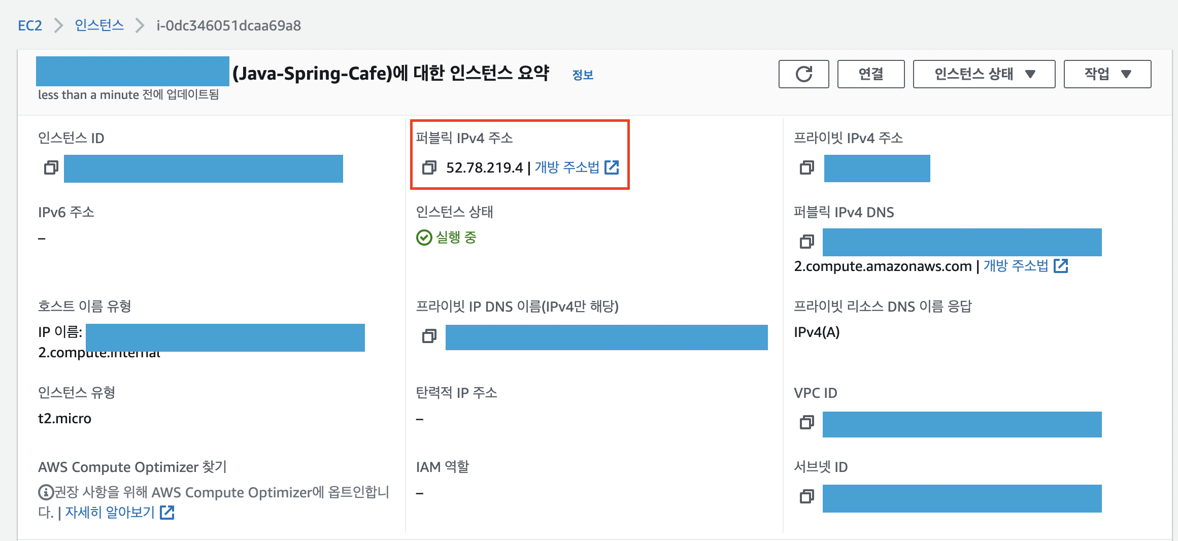 우리가 만들었던 인스턴스에 들어가면 다음과 같이 퍼블릭 IPv4 주소를 통해 확인할 수 있다.