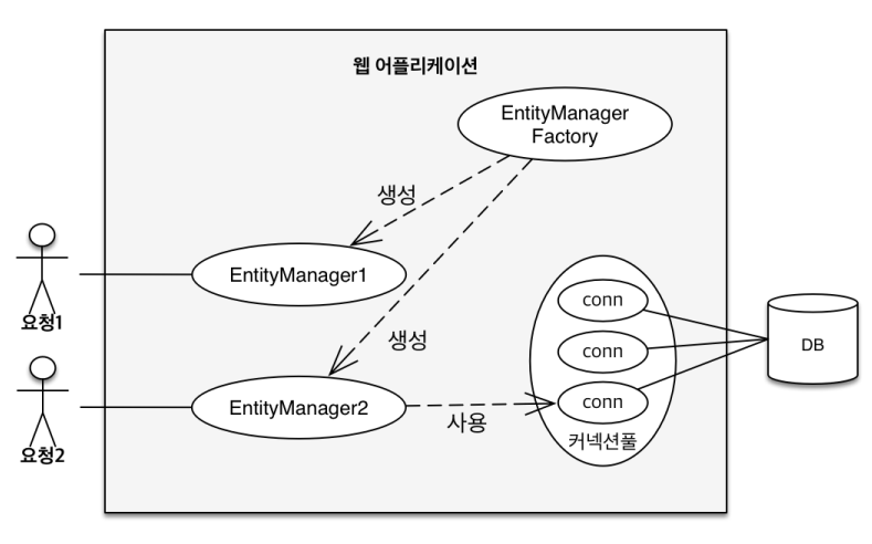 이후 사용자의 요청이 들어올때마다 EntityManager를 생성하게 됩니다. 고객의 요청이 들어오면 EntityManager를 생성하고, 요청에 의한 쿼리문이 다 작업이 끝나면 다시 close() 하기를 반복합니다.