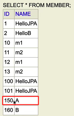 다음 코드를 수행하기전 ID 150 의 NAME은 "A" 이다.