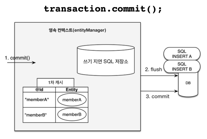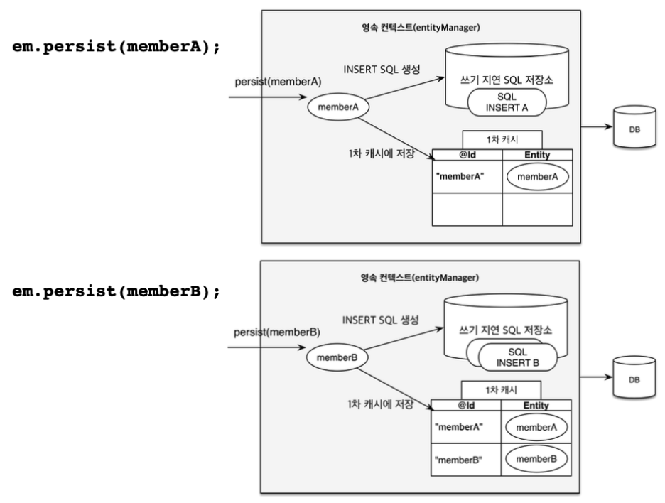 위의 그림에서는 memberA 와 memberB는 둘다 1차 캐시에 저장되면서, 쓰기 지연 SQL 저장소에 INSERT문이 생성되어 저장된다.