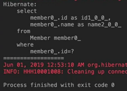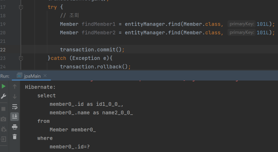 위 코드를 실행하면 맨처음 find()해올때 member를 DB에서 찾아오기 위해 SELECT 문이 수행된다.