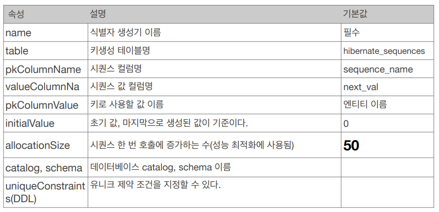@SequenceGenerator 의 속성들은 다음과 같다.