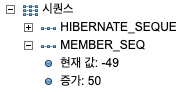 이때 빨간박스 안처럼 "MEMBER_SEQ" 라는 시퀀스 오브젝트를 생성하는것을 확인할수 있다.