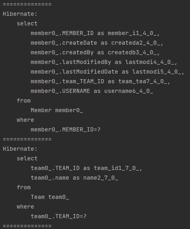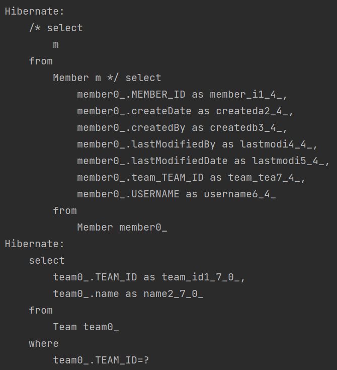 즉, JPQL은 1번 쿼리가 나갔지만, 2개의 쿼리를 확인할수 있게된다. 다음 결과를 확인해 보자.