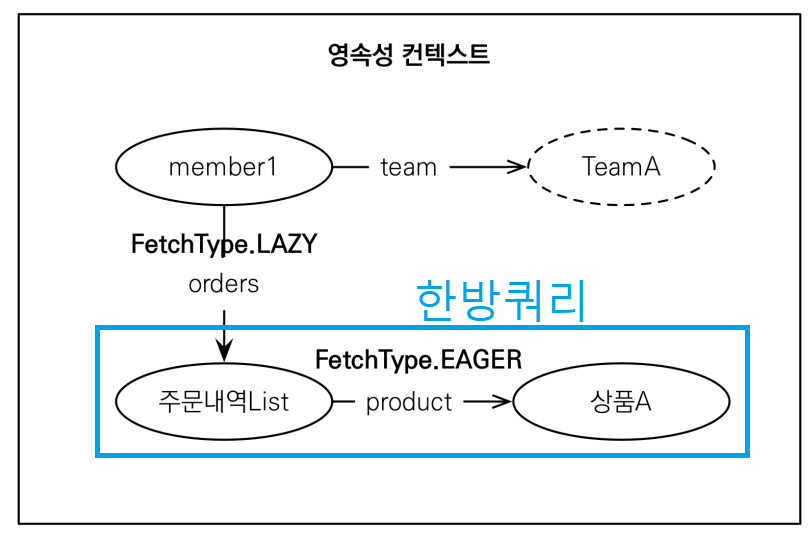 이후 JPQL fetch 조인이나, 엔티티 그래프 기능을 사용해라. 즉시 로딩은 내가 의도하지 않은 쿼리가 수행된다.