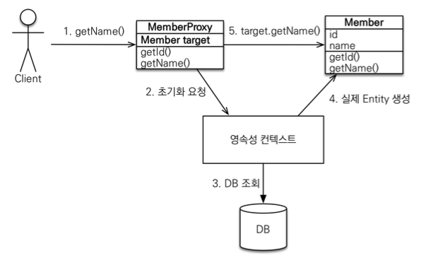getReference()로 찾아온 member는 Proxy이다. 이후 member.getName()을 호출할때 발생하는 일은 다음과 같다.
