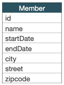 필드가 너무 복잡하지 않은가? (startDate + endDate) 를 한덩어리로 만들고, (city + street + zipcode)를 한 덩어리로 만들면 좀더 편하지 않을까?