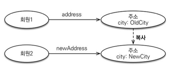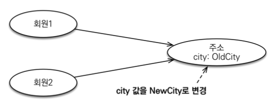 회원1 과 회원2가 같은 주소 값타입을 참족하고 있다. 여기서 주소 값타입을 한쪽에서 변경하면 회원1, 2 양쪽에서 모두 바뀌어 버린다.