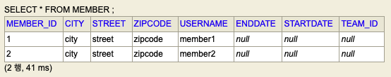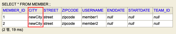 member1, 2 모두 CITY 컬럼이 city값으로 되어있다.