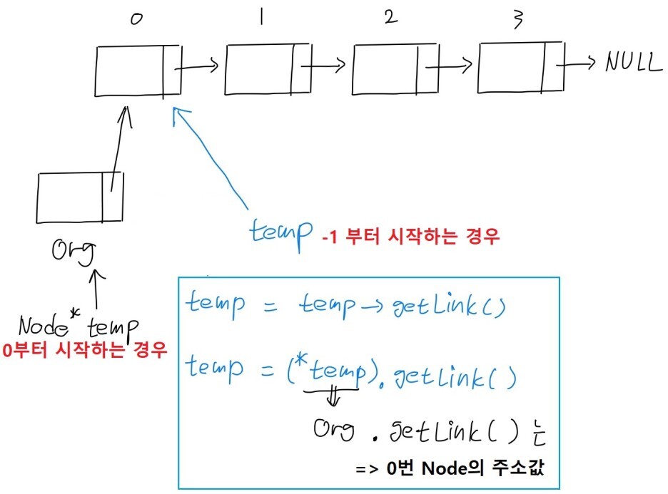 - i 가 0 부터인 경우: pos가 0 이니 0 < 0은 거짓이 되어 for문 안의 연산이 진행되지 않았고, 따라서 head 노드를 가리키게 된다.