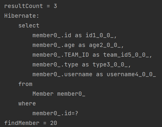 resultCount 출력 후, clear()하였기 때문에 Select 쿼리가 새로 나가고, Member의 나이는 조회해온 20으로 출력된다.