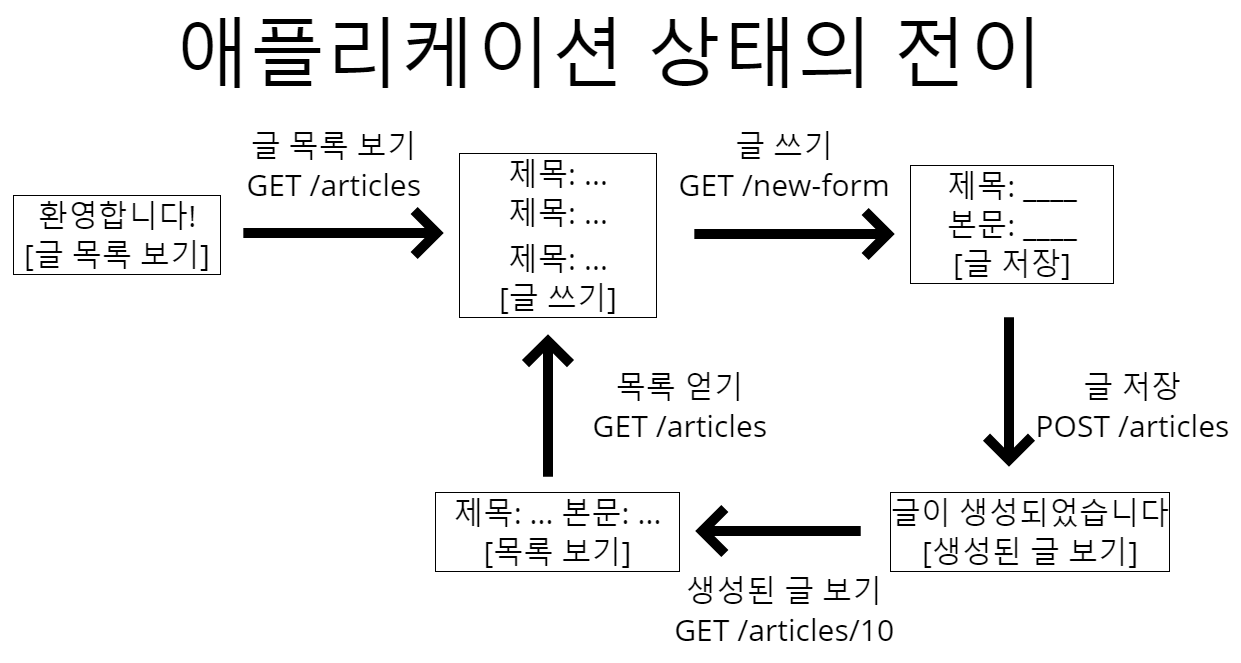 루트 홈페이지 → 글 목록 보기 GET → 글 쓰기 GET → 글 저장 POST → 생성된 글 보기 GET → 목록 보기 GET → ...