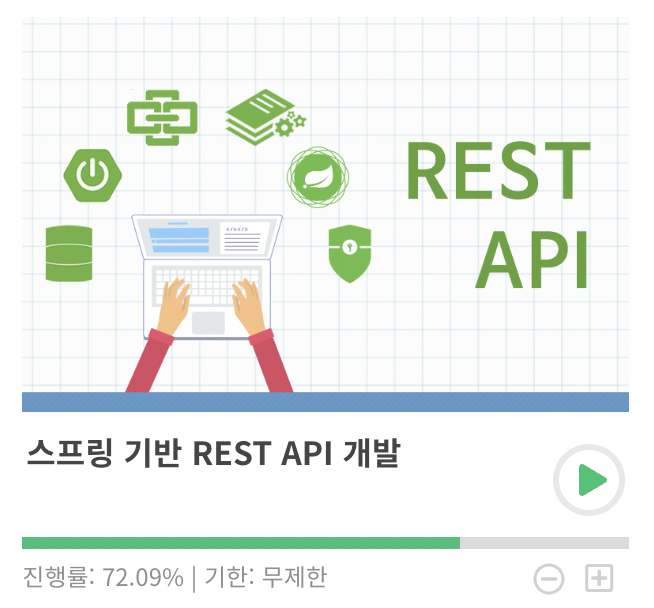 rest api를 조금더 깊이있게 공부하기위 해서 지난주부터 듣기 시작한 강의를 72% 까지 들었다.