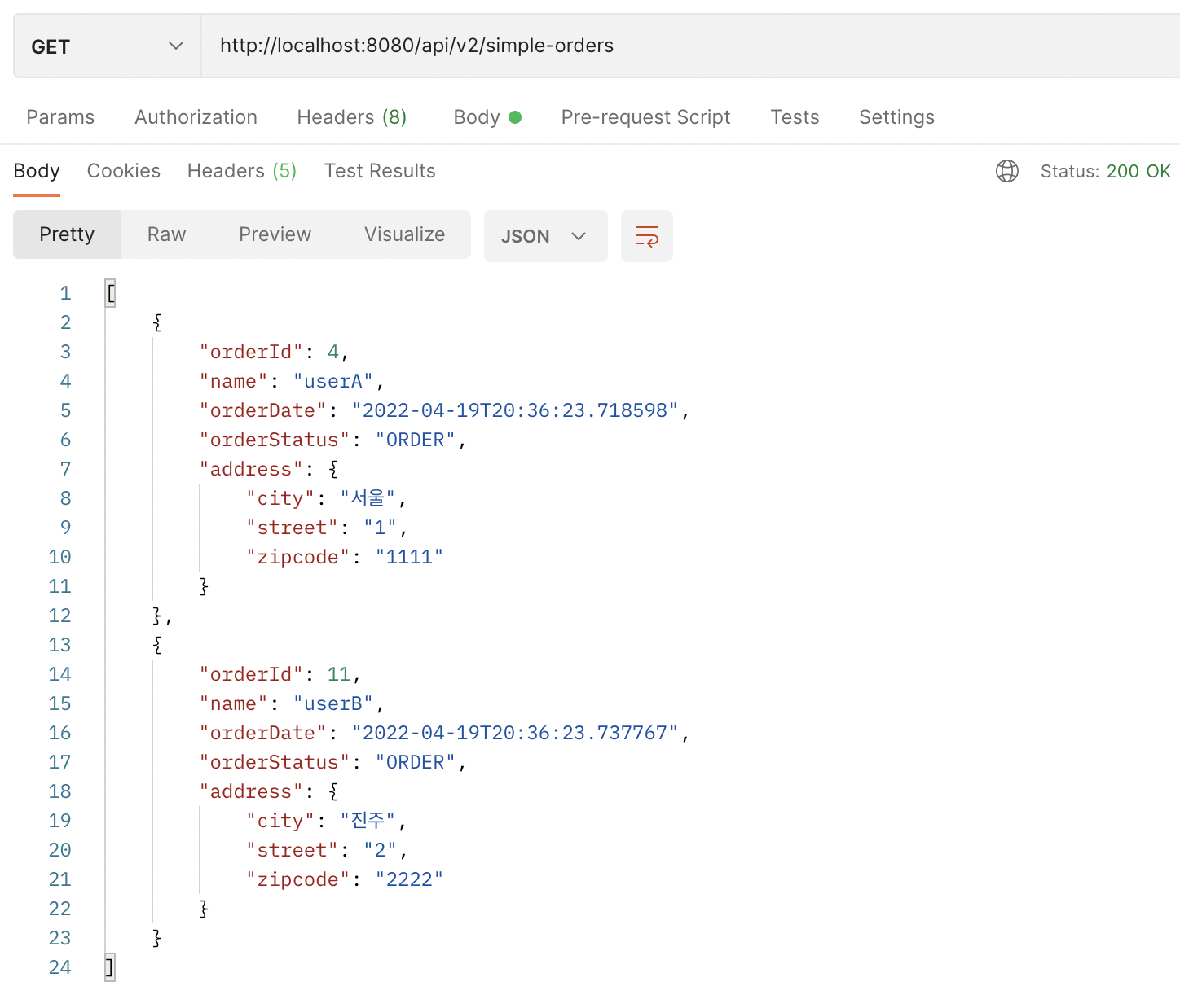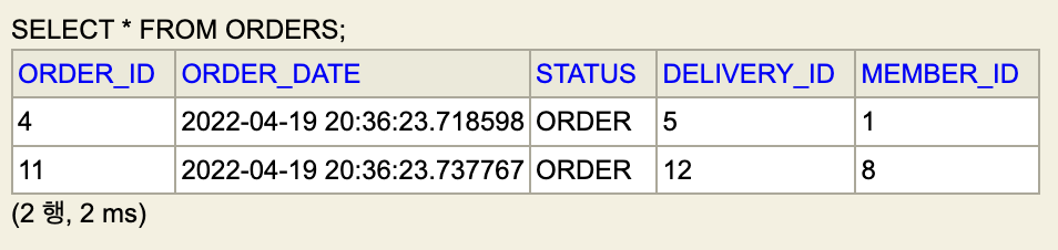가장 먼저 다음과 같이 Order를 조회해 온다. 총 2건의 Order를 우리의 예제에서는 조회하게 된다.