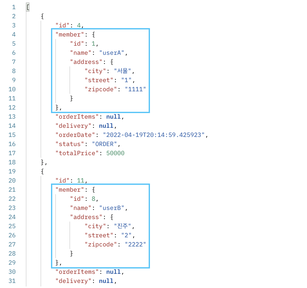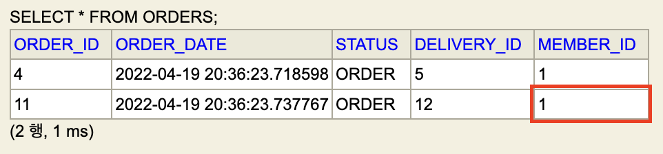 하지만 2개의 주문 모두 1번 member가 주문했다면?, 즉 오른쪽 사진 처럼 된다면 어떻게 될까?