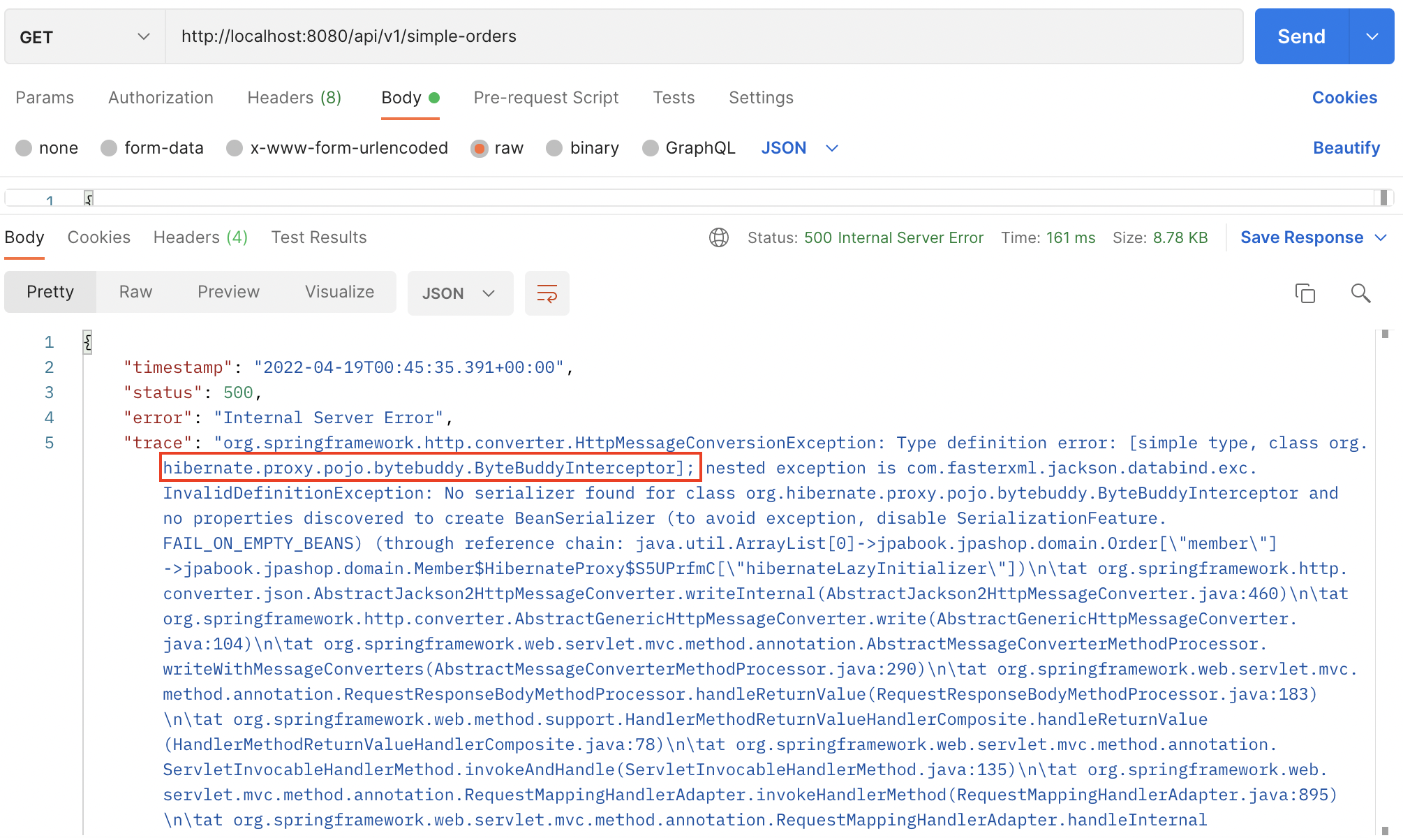 trace부분을 잘 읽어보면 hibernate.porxy.pojo.bytebuddy.~~ 의 오류가 발생했음을 알 수 있다.
