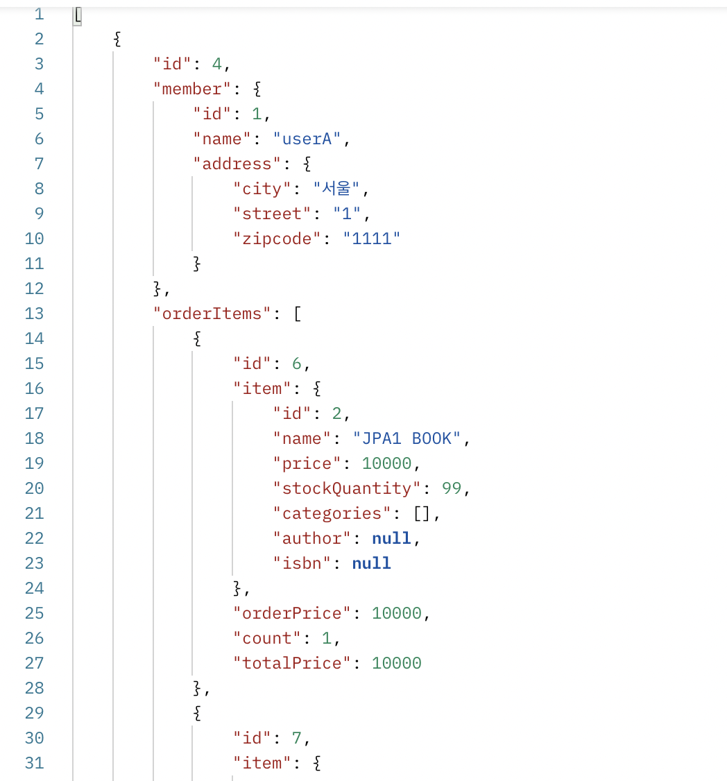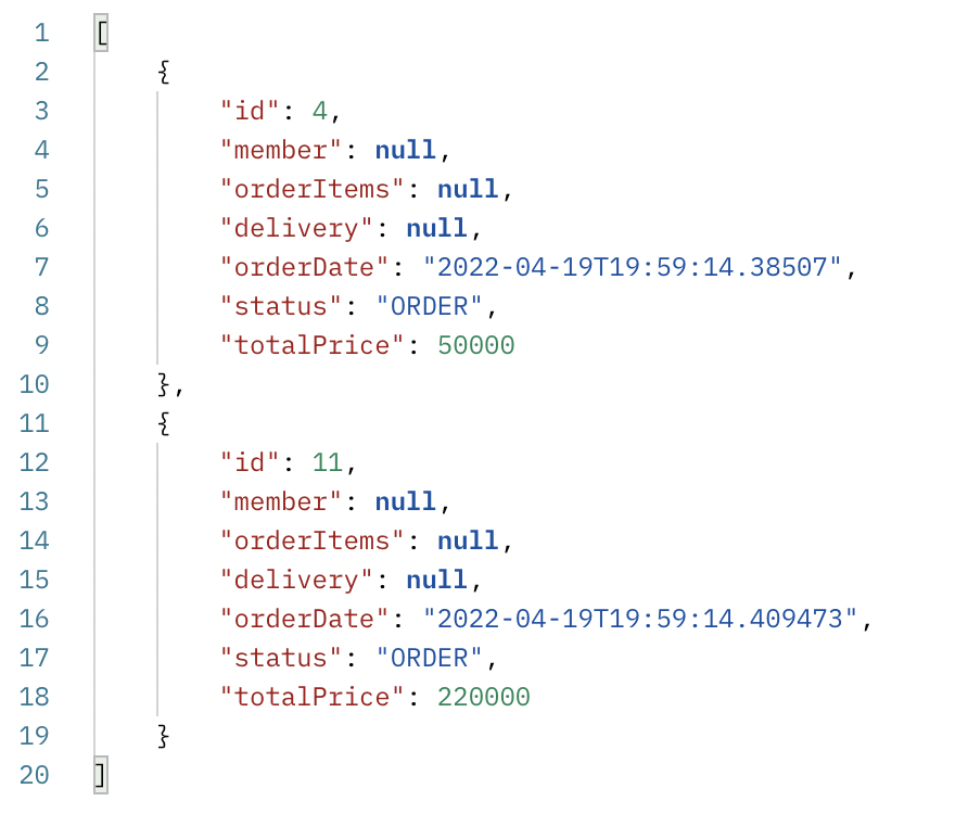 지금 우리의 Controller는 List<Order>를 직접적으로 반환하고 있다. 이런 식의 엔티티를 직접 노출하는 것은 좋지 않다.