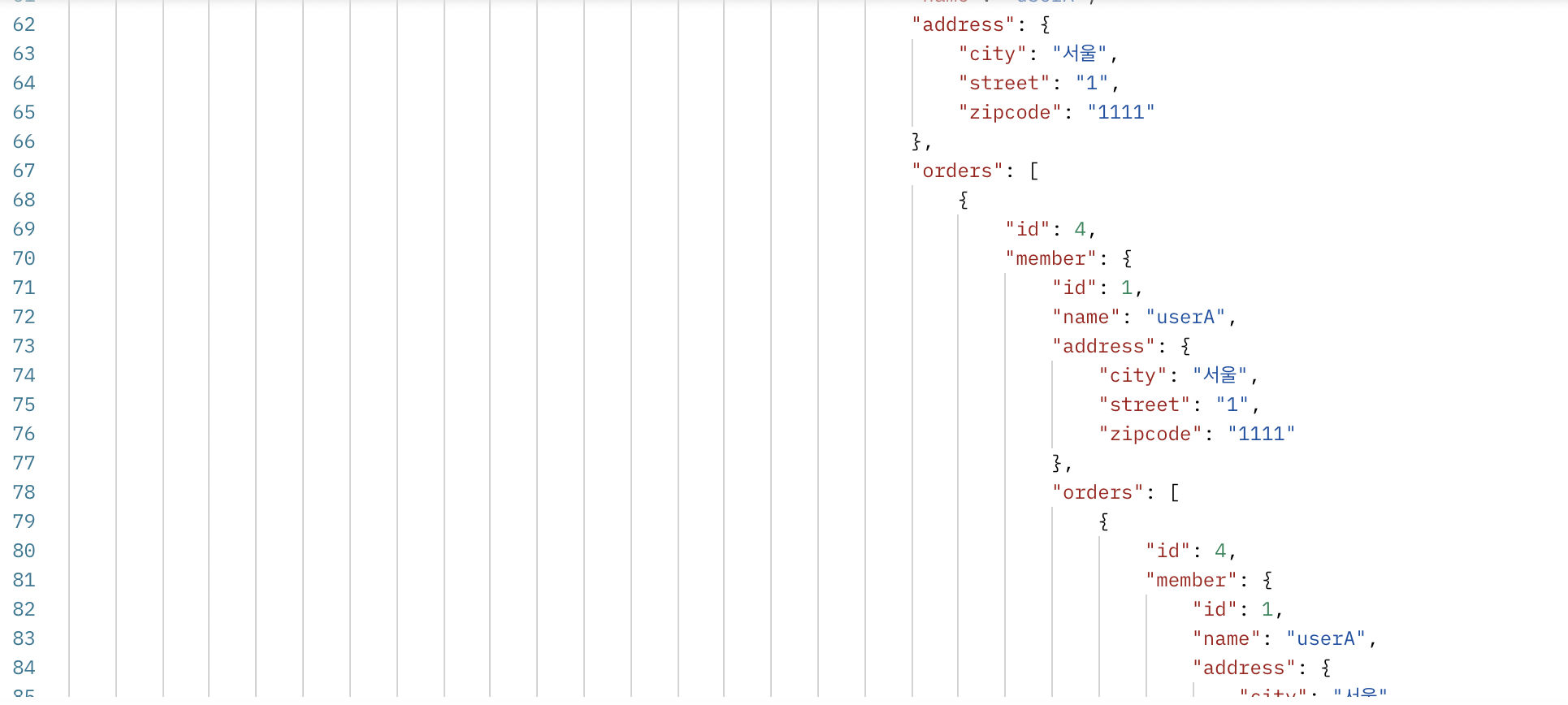 따라서 다음과 같이 끝없는 Json이 출력되게 되어버린다.