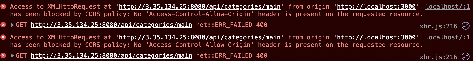 만약 허용되지 않는 Origin이면 CORS 정책 위반 이슈가 발생하게 됩니다.