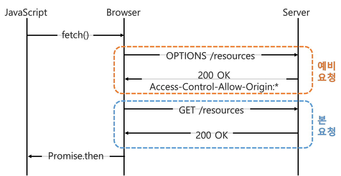 브라우저는 단순 요청과 동일하게 response로 온 Access-Control-Allow-Origin 헤더를 확인해서 CORS 동작을 수행할지 판단합니다.