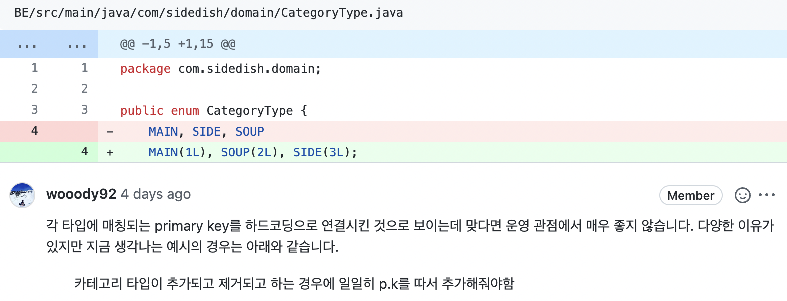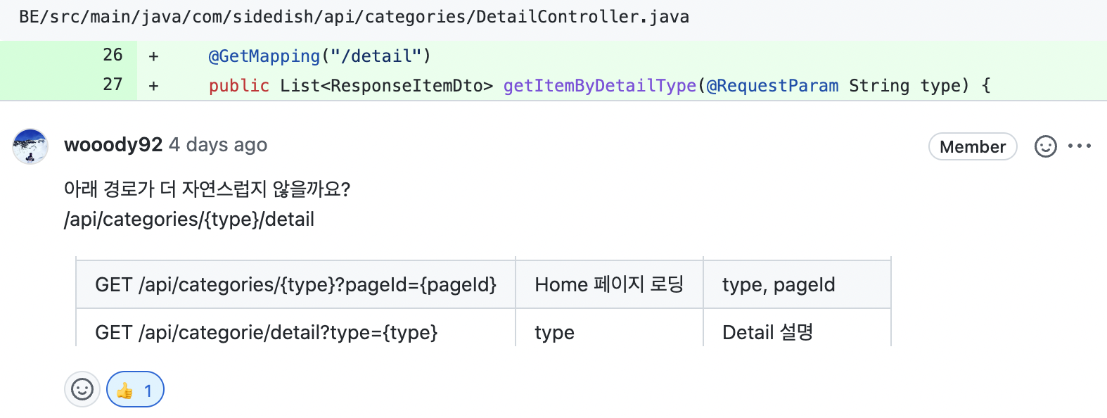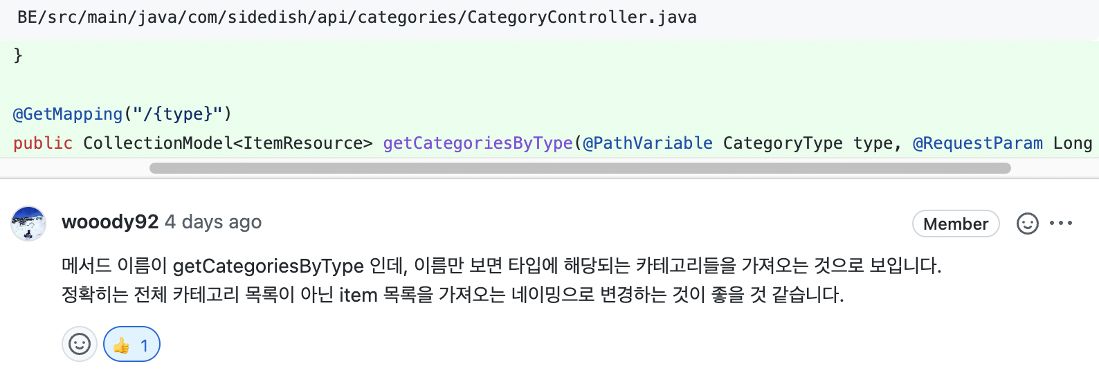 URL 또한 카테고리가 동적으로 늘어날 수 있다는 점에서 type을 경로 변수로 받도록 수정한점이 더 좋다는 답변을 얻게 되었다!