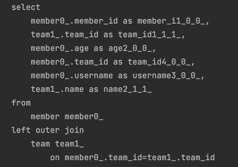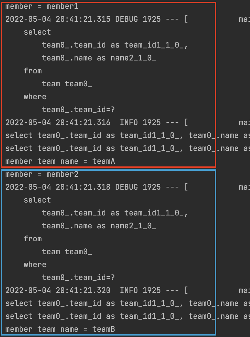 출력되는 쿼리문을 보면 한번에 member 와 team에 대한 정보를 모두 가져오는것을 알 수 있다.